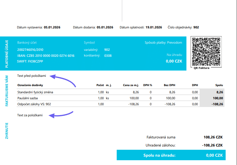 Druhou novinkou je možnosť zadať v nastavení pluginu texty, ktoré sa zobrazia pred a za položkami faktúry.