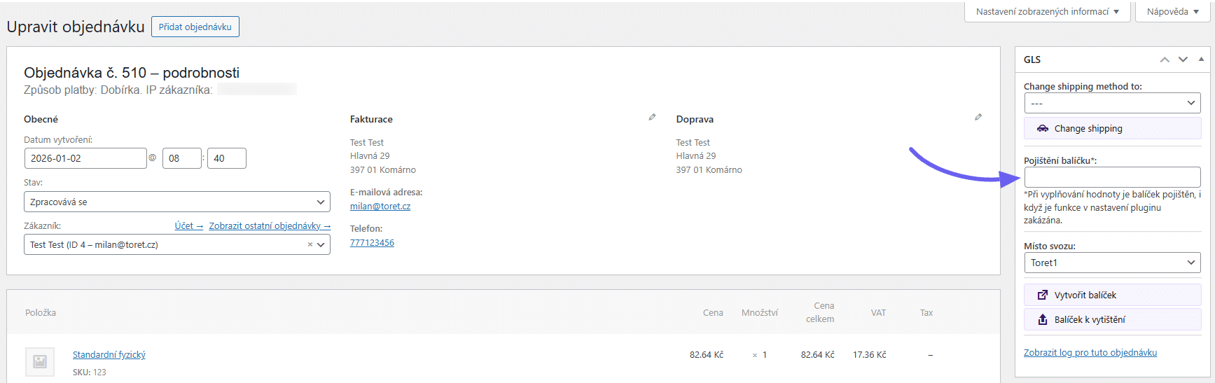 - Poistenie balíka: Plugin po novom umožňuje nastaviť službu pripoistenia balíka (Declared Value Insurance Service). Toto poistenie môže byť automaticky vo výške hodnoty objednávky alebo je možné hodnotu manuálne upravovať pre každú zásielku zvlášť – v detaile objednávky.